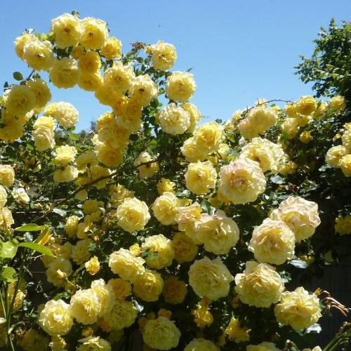 A floribunda rose with warm yellow, full petalled blooms in abundance throughout the entire growing season. Very popular and known for flowering early in spring. Ideal for climbing up a trellis or support.